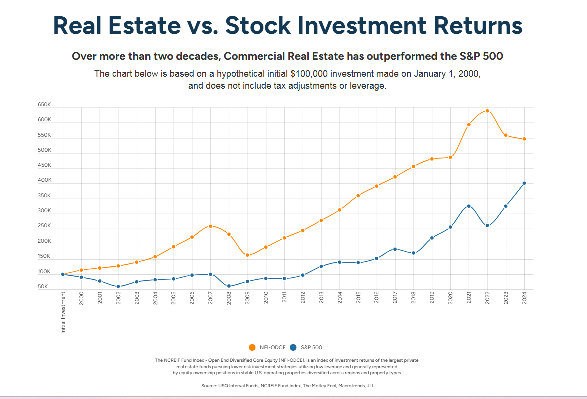 Over more than two decades, Commercial Real Estate has outperformed the S&P 500 The chart below is based on a hypothetical initial $100,000 investment made on January 1, 2000, and does not include tax adjustments or leverage.
